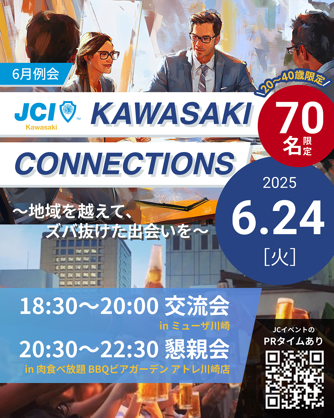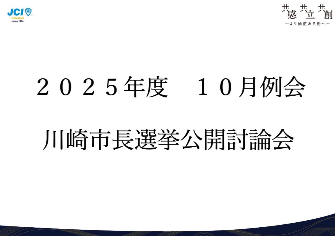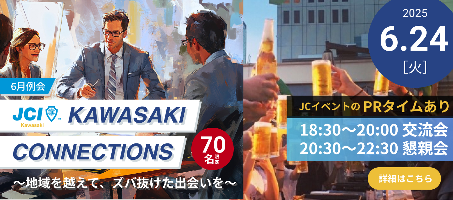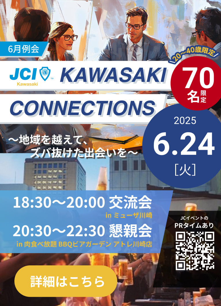 一般社団法人川崎青年会議所は、全国各地に広がる青年会議所LOM(Local Organization Member)のひとつであり、1951年より川崎市を拠点とした地域活動を行っています。さまざまな職業の社会人が集い、各自の目標を持ち、地域社会の ため、あるいは全国・全世界を視野に入れた活動をしています。
